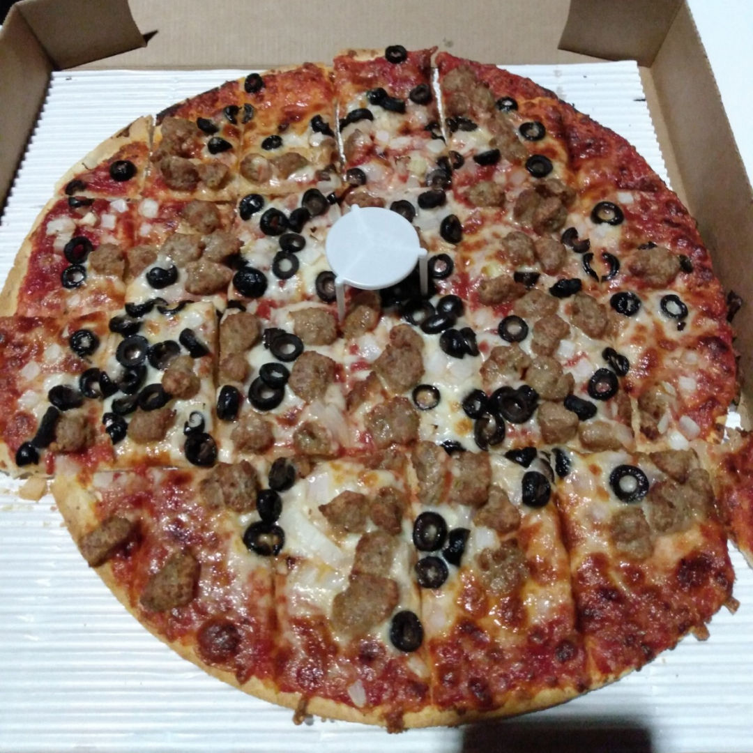 Large, Thin Crust; Sausage, Black Olives and Onions