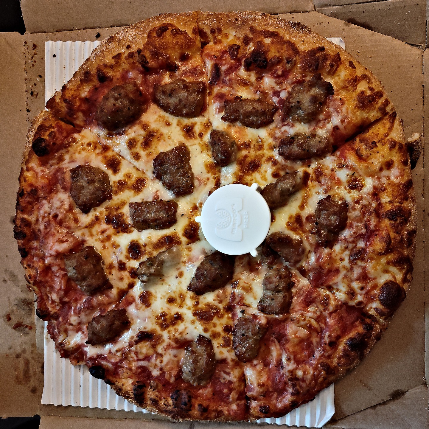 ► I ordered a sausage, pan pizza for delivery. The crust was cooked well. The sauce was as I remembered. Sausage tasted okay.